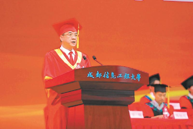 成都信息工程大学校长余敏明在毕业典礼上,作了主题为“力戒浮躁开创未来”的讲话。