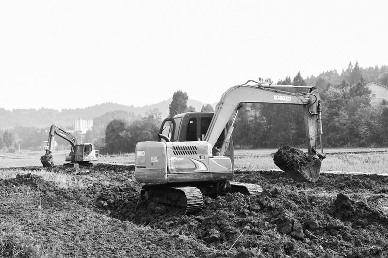 余台挖掘机在高标准农田建设现场多点作业,进行田块调形、沟渠整治和修筑下田坡道等工作,力争在明年