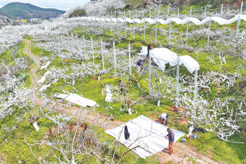 3月2日,南充阆中市江南街道同亨四季水果种植专业合作社果园内,李花、桃花竞相绽放。花丛间,工人们正忙着搭建智能遮阳防雨棚。