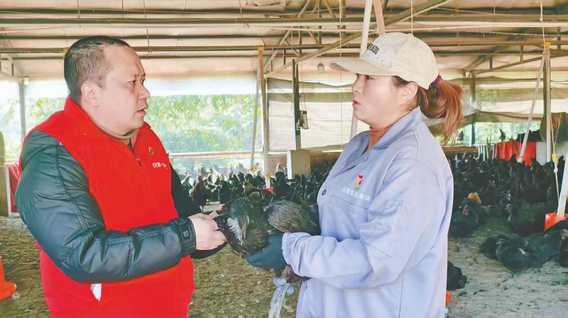 张国友(左)向蛋鸡养殖户了解生产情况。 周超文 摄