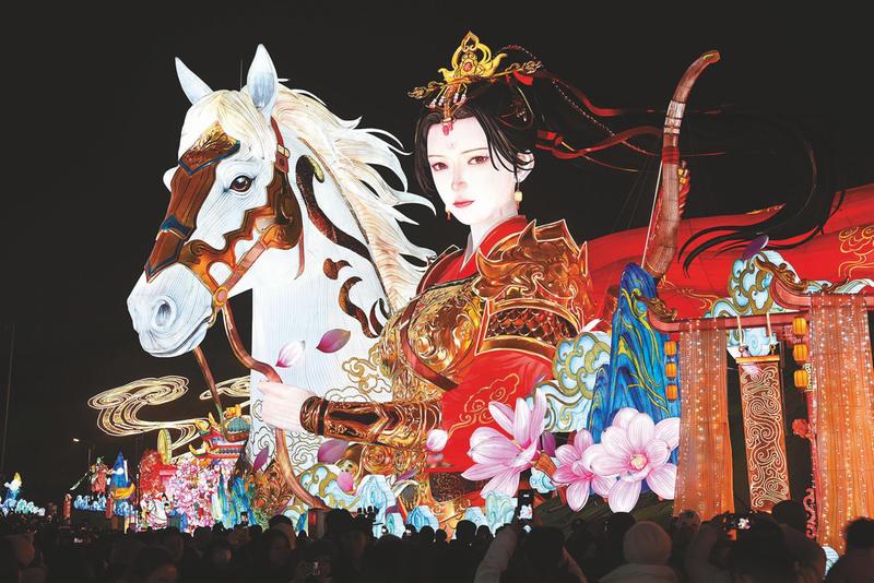 本届灯会以“灯绘华夏 筑梦未来”为主题,打造了“中国结大道”“木兰传奇”十大主题板块,制作11组超大型灯组及200余组中小型非遗彩灯,以智能光影、数字投影等前沿科技构建沉浸式叙事空间,让彩灯从“景观”变为可沉浸、可对话的“文化生命体”。作为国家级非物质文化遗产,自贡灯会有“天下第一灯”美誉,是全国两大民俗活动之一,迄今已有上千年历史。(本报通讯员 兰自涛 摄影报道)