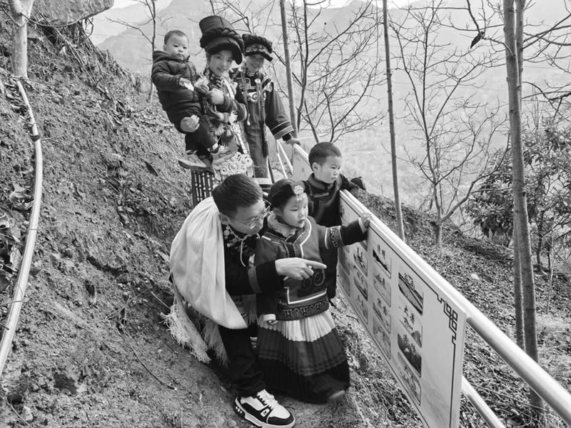 文店村彝族家庭带孩子参观展板。金口河区委宣传部供图