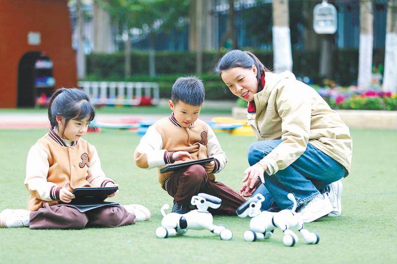 3月26日,乐山市金苹果邦泰幼儿园开展了以“探秘机器狗 点亮科技梦”为主题的科普活动。活动通过App演示、现场问答、互动游戏等形式,让孩子们近距离感受科技魅力,激发科学兴趣。图为老师带领孩子们与机器狗互动。