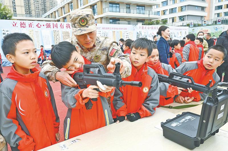 11月13日,内江市东兴区牛牦山小学联合当地人民武装部开展“国防教育进校园”主题活动,通过武器装备展示、互动交流体验等形式,引导学生从小树立国防观念,增强国防意识,弘扬爱国主义精神。图为学生在工作人员的指导下体验武器装备。(本报通讯员 兰自涛 摄影报道)