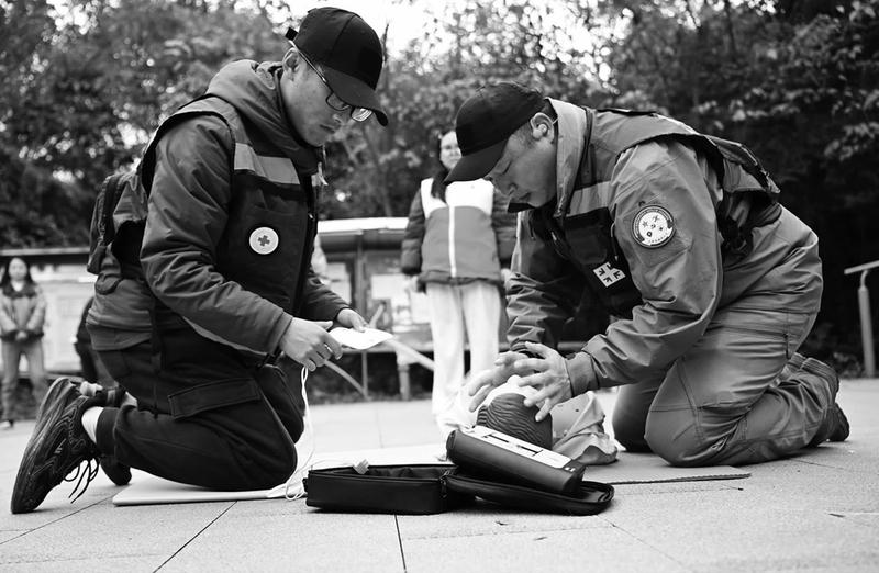 12月4日,内江市东兴区西林街道五星社区公园里小区的红十字楼栋救护员正在进行应急救护演练。