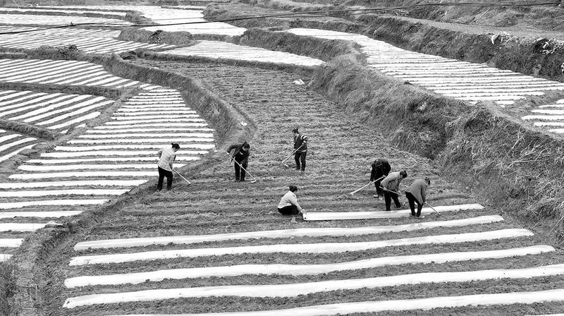 3月25日,巴中市南江县关坝镇小田村,村民在玉米高产示范片区忙着整地、覆膜,有条不紊地筹备大豆玉米带状复合种植。