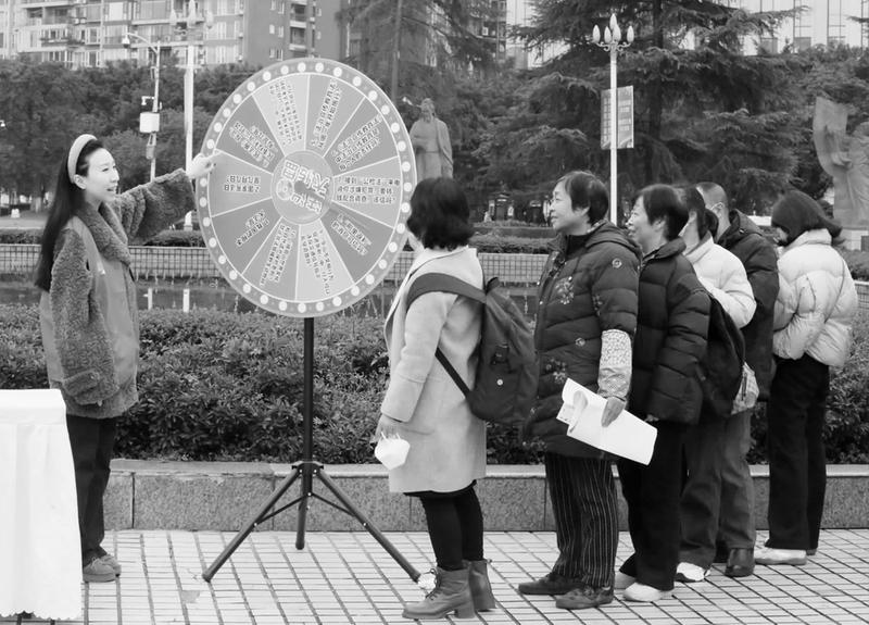 ▲12月4日,乐山市市民排队玩法治大转盘游戏,这种寓教于乐的普法方式让宪法知识“活”了起来。(李华时 摄影报道)