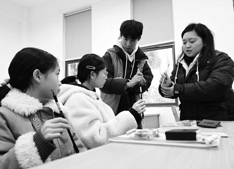 寒假期间,内江市东兴区永福镇依托辖区村委会等阵地开展爱心托管服务,为儿童提供课业辅导、兴趣培养、心理疏导等服务,让他们在充实、暖心的寒假中快乐成长。图为2月2日,志愿者在曹家沟村村委会教授孩子毛笔的正确拿握姿势。(李建明 樊文秀 摄影报道)