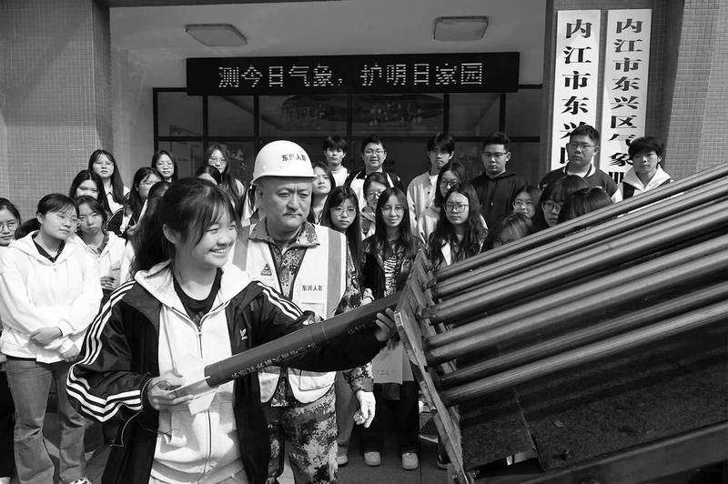 3月21日,内江市东兴区气象局开展气象开放日活动,邀请内江师范学院的大学生走进东兴区气象观测站,近距离观看气象设备,学习气象知识,了解气象观测和天气预报的奥秘。图为大学生体验气象设备。