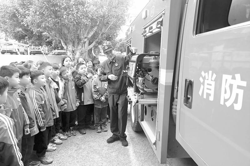 3月30日,内江市东兴区郭北镇中心学校联合东兴区消防救援局开展“安全伴我行,快乐成长路”主题活动,通过培训消防器材使用方法、开展紧急疏散演练等方式,提升学生消防安全意识和应急自救能力。图为消防员给学生介绍消防救援装备。(本报通讯员 兰自涛 摄影报道)