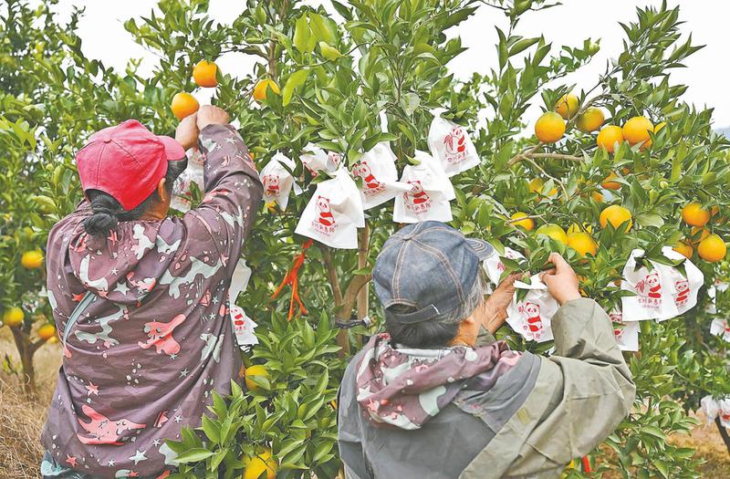 11月7日,内江市东兴区富溪镇天赐村漫山遍野的柑橘园里,黄澄澄的果实缀满枝头,丰收在望。村民穿梭在果园里,手脚麻利地给柑橘套袋,该举措既能提升果品品质,又能延长挂果期,为接下来的丰产增收打下坚实基础。(李建明 摄影报道)