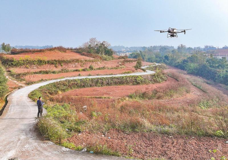 今冬以来,地处山区的广安华蓥市积极投入“天府粮仓”建设,通过耕地流转的方式,在高兴镇高坪片区的小块农田和山坡地上建起5000余亩粮食现代农业园,推动传统农业向现代农业升级转型,为乡村振兴注入科技动能。图为近日,高兴镇粮食现代农业园区里,工作人员在山坡地上用无人机播种小麦。(邱海鹰 摄影报道)