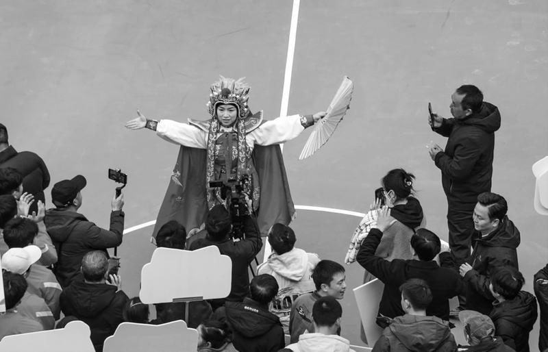 12月6日,巴中市通江县胜利乡篮球场上,文艺志愿者为群众表演川剧《变脸》。