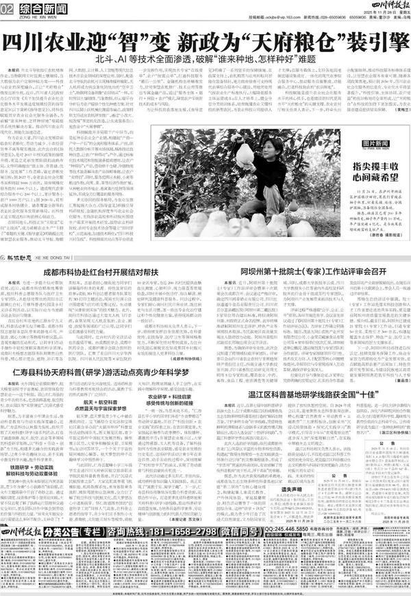 本报讯 当北斗导航指引农机精准作业,当物联网实时监测土壤墒情,当大数据为农户定制种植方案……科技与农业的深度融合,正让“天府粮仓”焕发出新生机。近日,四川省人民...