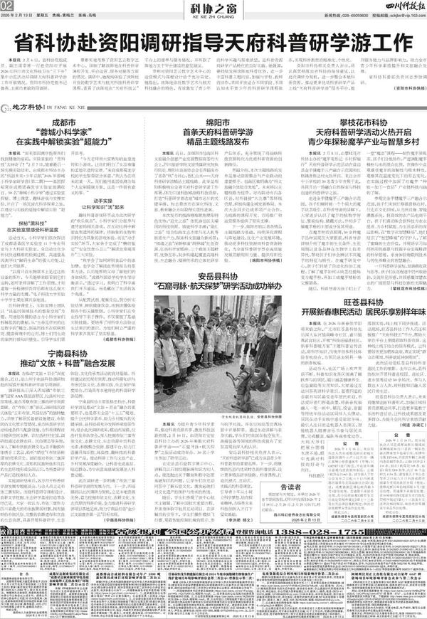 本报讯 2月6日,省科协党组成员、副主席辜彬一行赴资阳市开展2026年四川省文化科技卫生“三下乡”集中示范活动并调研天府科普研学游工作开展情况。资阳市科协党组书...