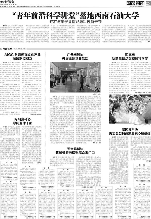 本报讯 近日,雅安市老科协、天全县老科协与天全县科协联合在天全县始阳镇多功社区开展“三下乡”科普服务活动,将优质服务送到群众家门口。活动吸引600余名群众参与。...