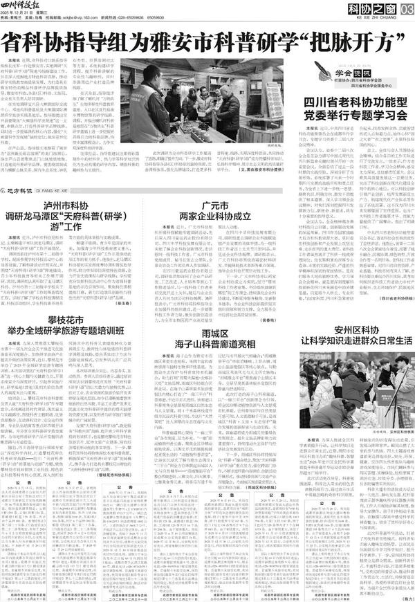 调研现场。本报讯 近期,省科协对口联系指导组组长沈军一行赴雅安市,实地调研“天府科普(研学)游”阵地与线路建设工作,旨在深入挖掘地方特色科普资源,推动研学实践教...