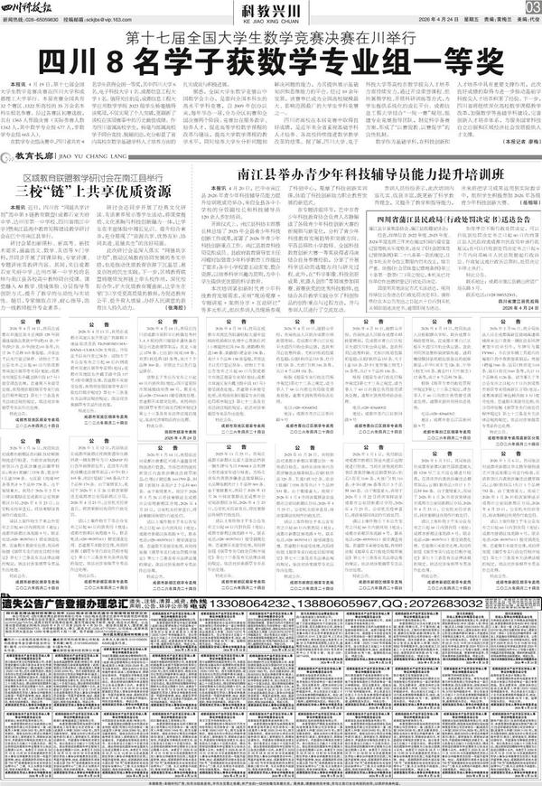 本报讯 4月19日,第十七届全国大学生数学竞赛决赛在四川大学和成都理工大学举行。本届竞赛全国共有32个赛区、1322所高校的35万余名本科生报名参赛。经过各赛区...