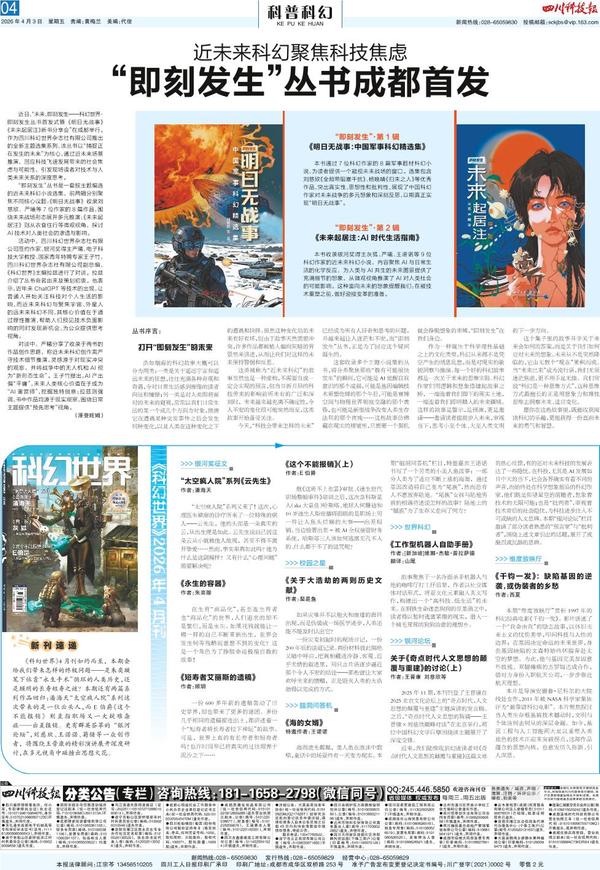 近日,“未来,即刻发生——科幻世界·即刻发生丛书首发式暨《明日无战事》《未来起居注》新书分享会”在成都举行。作为四川科幻世界杂志社有限公司推出的全新主题选集系列...