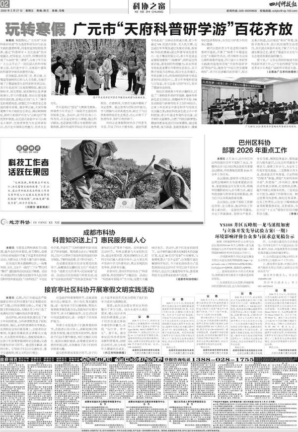 本报讯 为营造文明和谐的节日氛围,提升全民科学素质,春节期间,成都市科协系统组织开展了丰富多彩的科普活动,为群众送上科普大餐与新年祝福。在双流区黄水镇楠柳社区,...