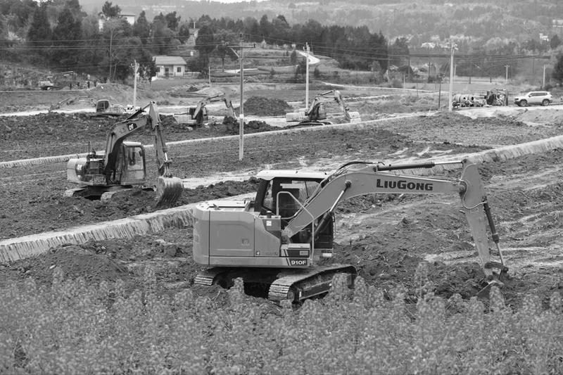 3月3日,在南充阆中市飞凤镇石佛场村高标准农田建设现场,20余台挖掘机在施工作业,现场一派忙碌景象。