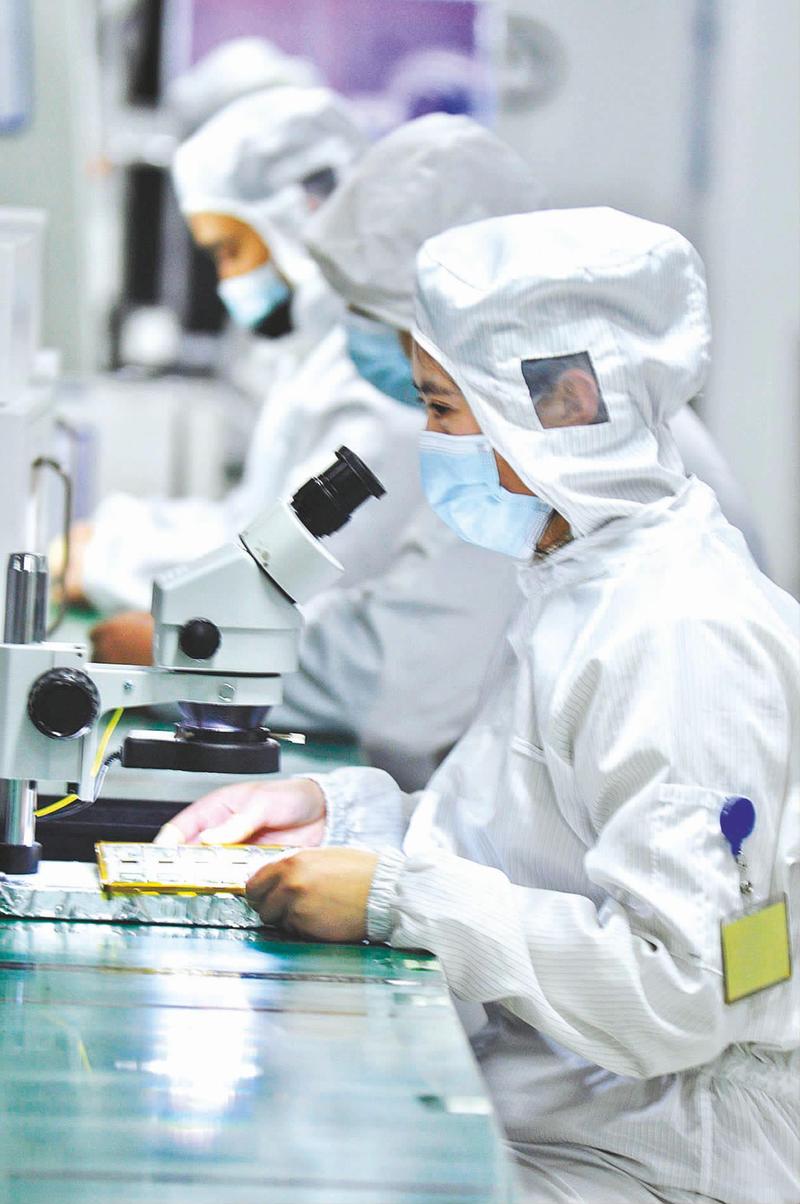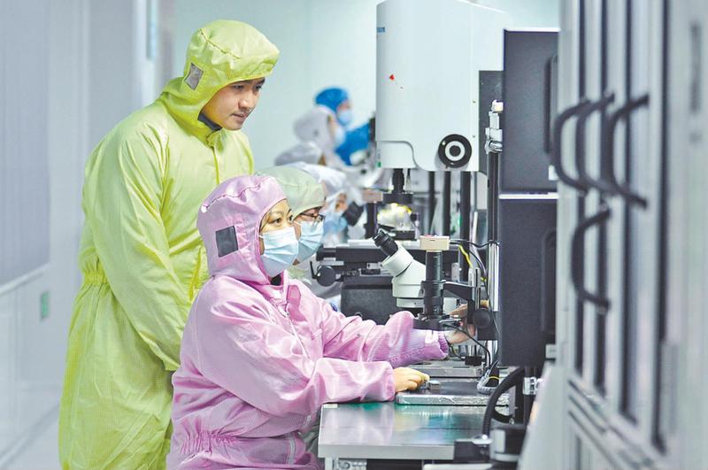 近年来,绵阳市游仙区聚焦数字化转型创新驱动发展战略,区科协“科服保姆”积极实施精准对接、全程跟进服务,联合中国移动通信集团四川有限公司绵阳分公司,助力国内唯一能同时进行8寸硅光晶圆级全自动化测试、硅光引擎、硅光模块研发与生产的全产业链公司,实现了企业智能化生产、产品品控、办公业务全流程数据互通,为通信行业硅光芯片器件领域高速光模块制造企业智改数转提能增效。图为四川超微光电子有限公司无尘车间内,品质检验员在进行8寸硅光晶圆来料检查和上料自动测试。(本报通讯员 成和平 摄影报道)