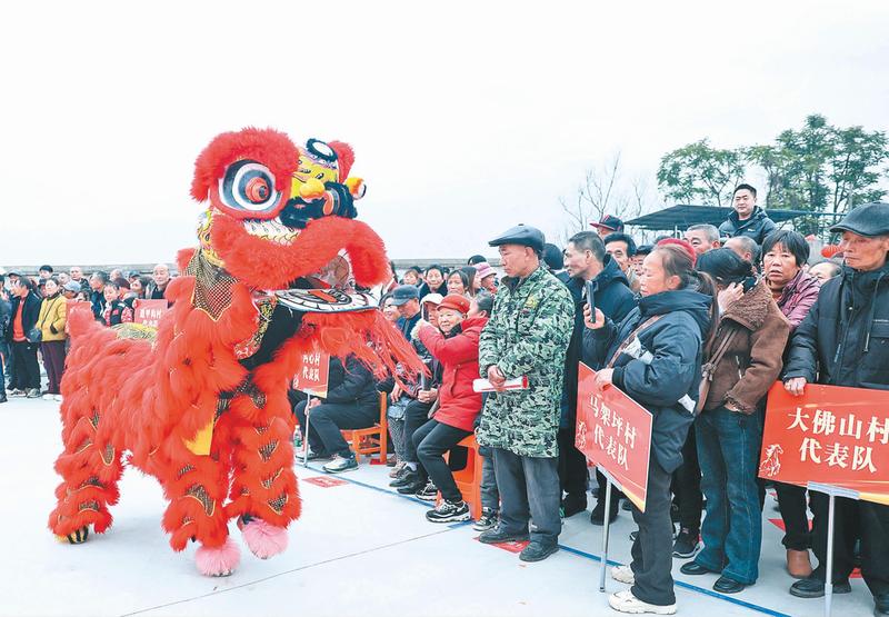 2月9日,广安华蓥市的民间艺人巡回到永兴镇大佛山村,为当地群众和在外务工返乡过年的乡亲表演舞狮、川剧变脸等节目,在欢乐喜庆的氛围中迎接新春佳节的到来。图为民间艺人正在进行舞狮表演。(邱海鹰 摄影报道)