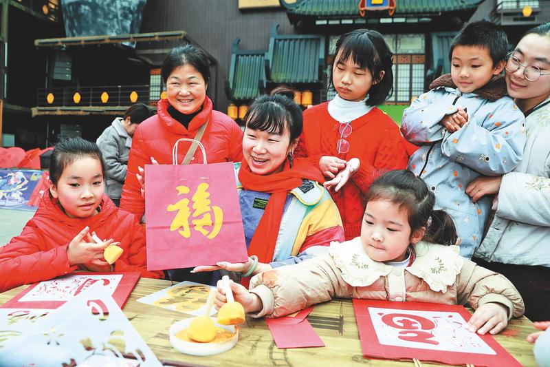 2月7日,泸州市纳溪区旅游部门联合当地书法家协会,在山河明月·醉酒城特色街区开展“迎新春·送祝福”活动。现场,书法家为市民和游客免费书写春联、赠送“福”字,志愿者积极指导小朋友体验非遗技艺,让传统年俗焕发新活力。图为志愿者指导小朋友们学习拓印技艺。(廖胜春 摄影报道)