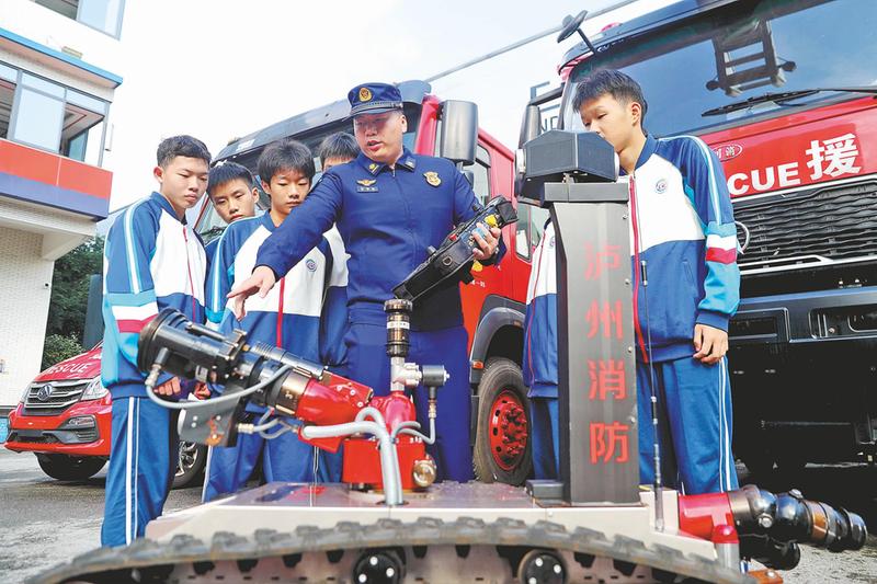 在全国消防日即将来临之际,泸州市纳溪区通过开展消防应急演练、消防装备展示、消防互动体验、消防安全知识宣讲等丰富多彩的宣传活动,帮助广大群众学习消防知识,增强消防技能和安全意识。图为消防员为纳溪区江南职业中学的学生介绍消防机器人的操作方法。(廖胜春 摄影报道)