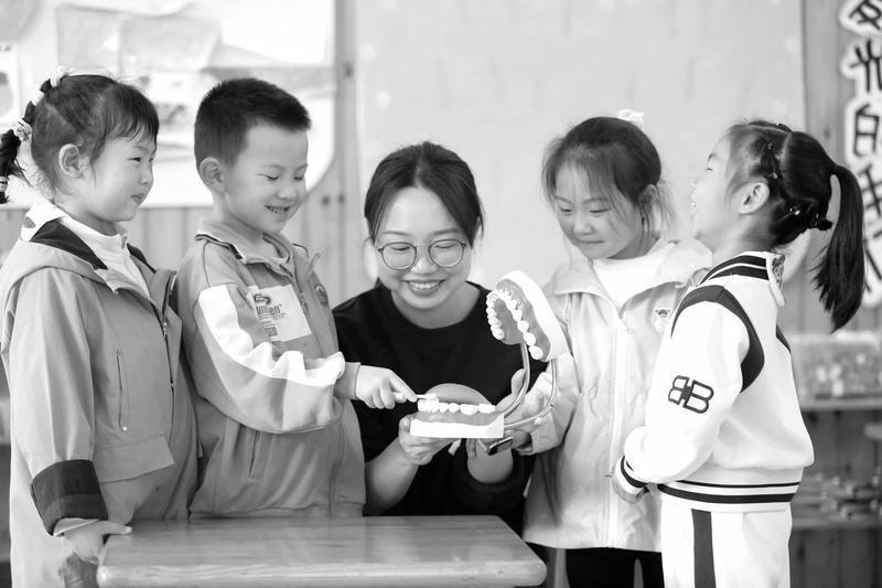 4月7日是“世界卫生日”,乐山市市中区翡翠实验幼儿园组织开展主题教育活动,教师结合幼儿年龄特点,通过形象逼真的模型道具,生动讲解了正确洗手、爱护牙齿、规律作息等实用健康知识。图为教师借助牙齿模型,直观演示正确的刷牙方式。(李华时 摄影报道)